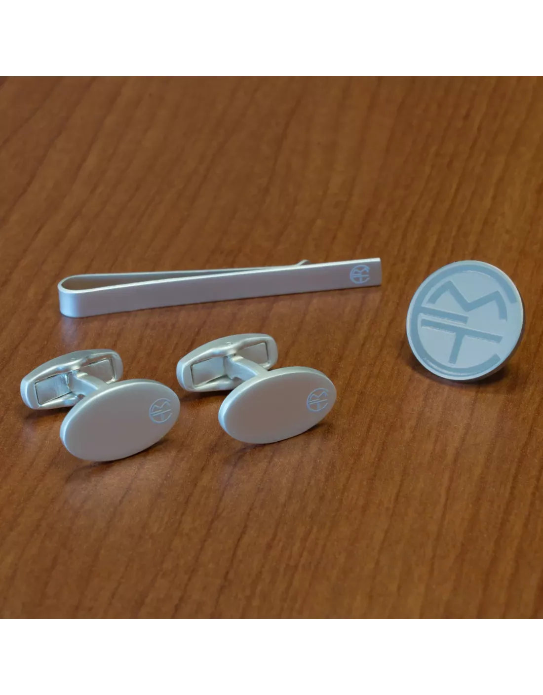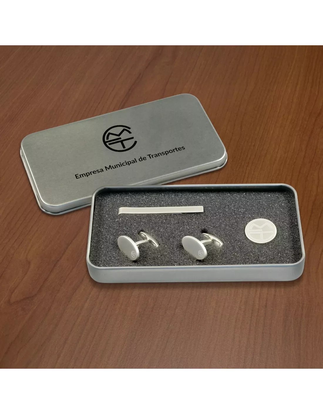 Elegante caja metálica de dimensiones compactas (13,4X6,9x1,7 cm) que contiene 1 pinza sujeta corbatas, unos gemelos y un pin con el logo histórico de la Empresas Municipal de Transportes.