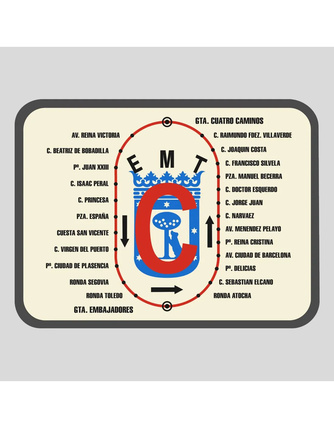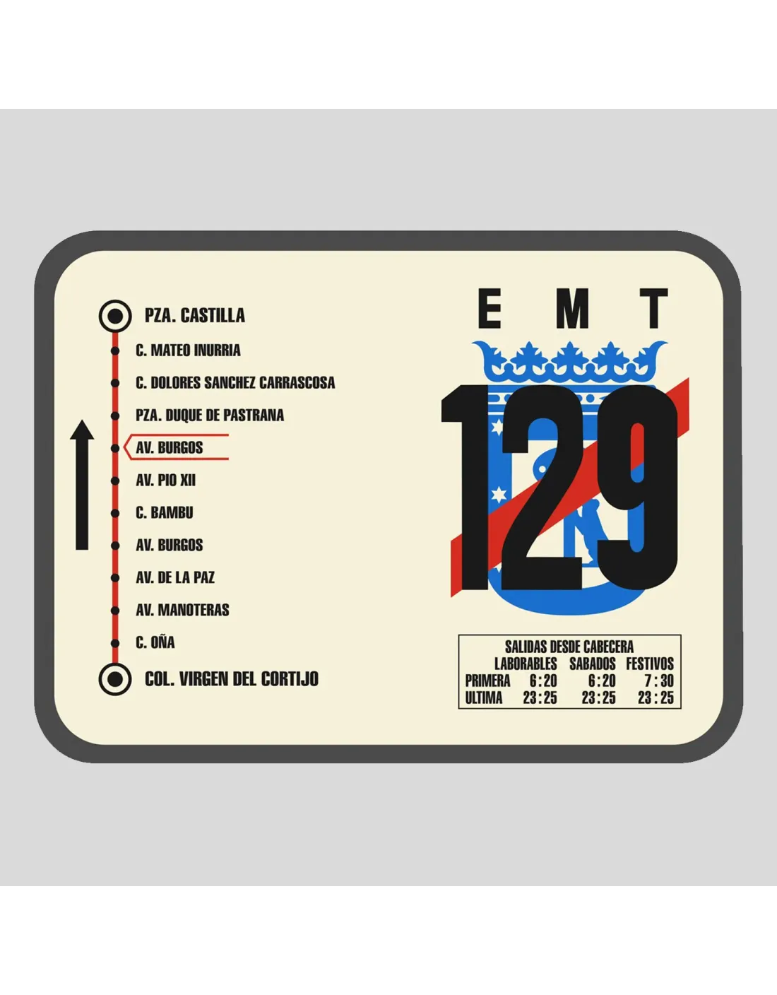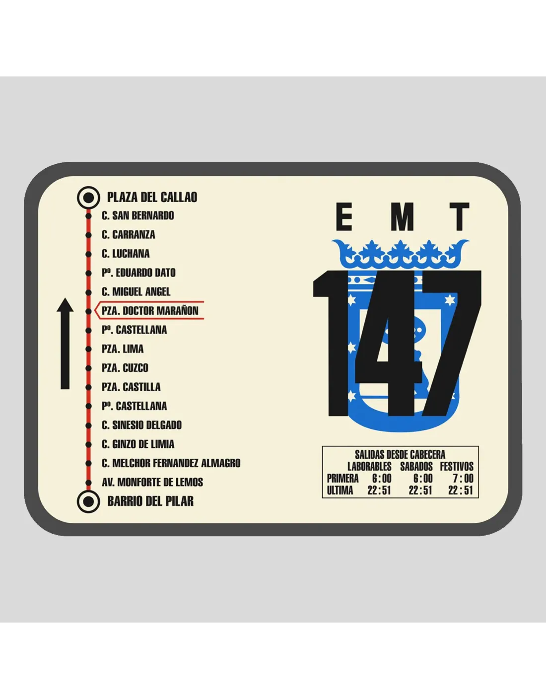 Ideal para coleccionistas, amantes de Madrid y de la decoración Vintage, esta reproducción en PVC de nuestras emblemáticas paradas rectangulares, visibles en las calles de Madrid desde 1972, revive la historia urbana de la ciudad.