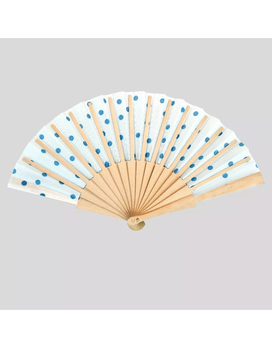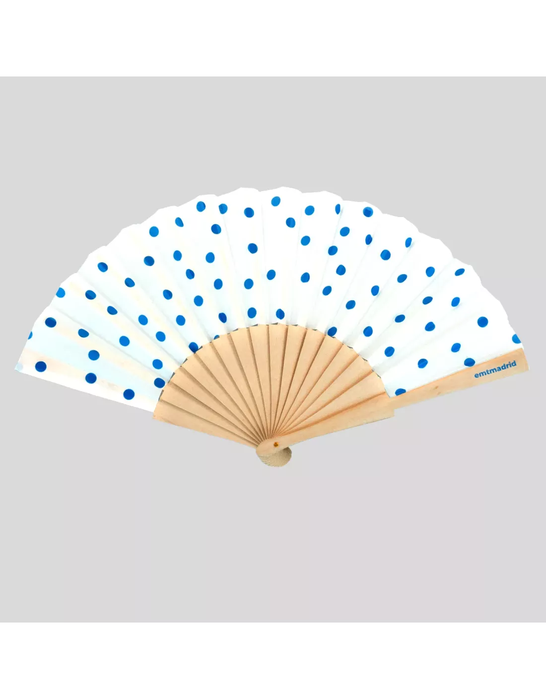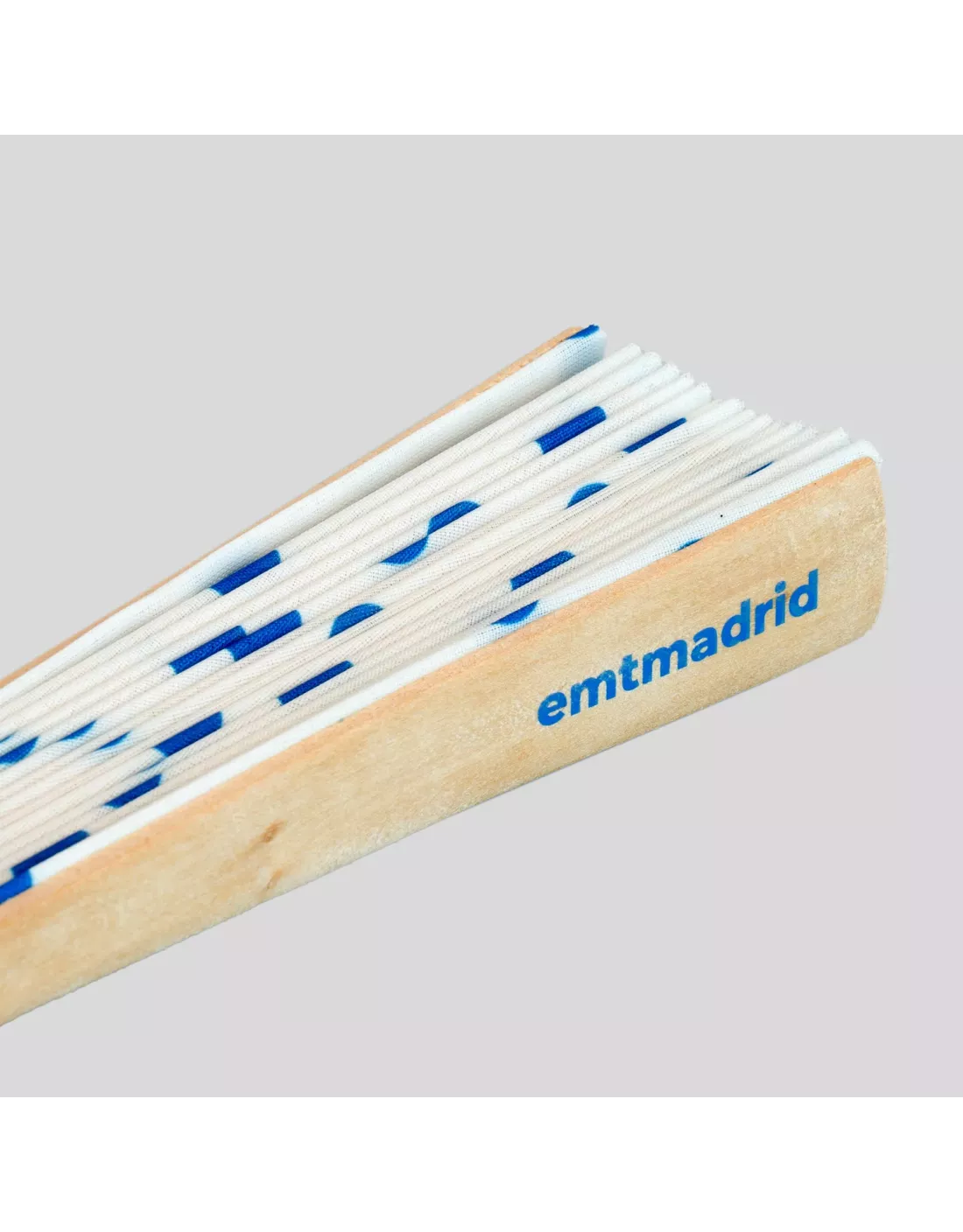 Abanico de diseño clásico que incorpora el azul corporativo de EMT, fabricado con estructura de madera y tejido de poliéster, cuenta con 14 costillas que permiten una apertura fluida y estable. Su tamaño es de 42x23 cm.
