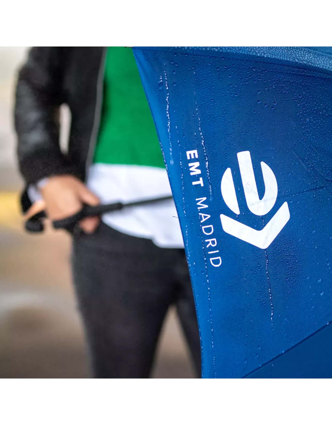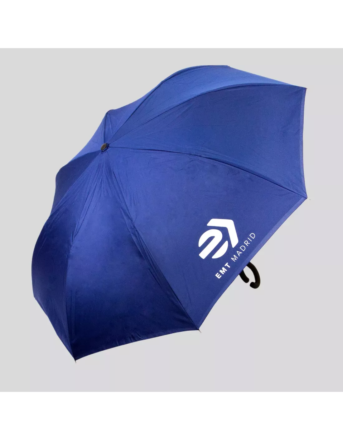 Paraguas reversible con logotipo de EMT Madrid en blanco. Diseñado para resistir viento y lluvia gracias a su material pongee ( tela fina, ligera y sedosa, reconocida por su durabilidad, resistencia al agua y a la abrasión, así como su fácil cuidado). Apertura manual, varillas de fibra y cierre con velcro.