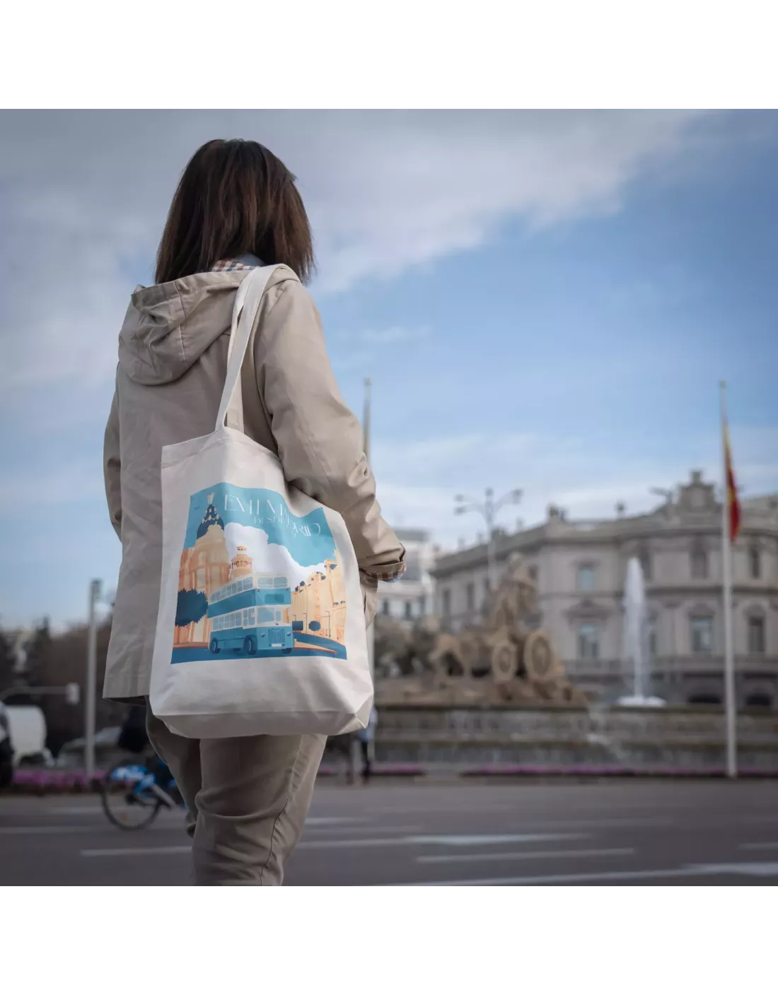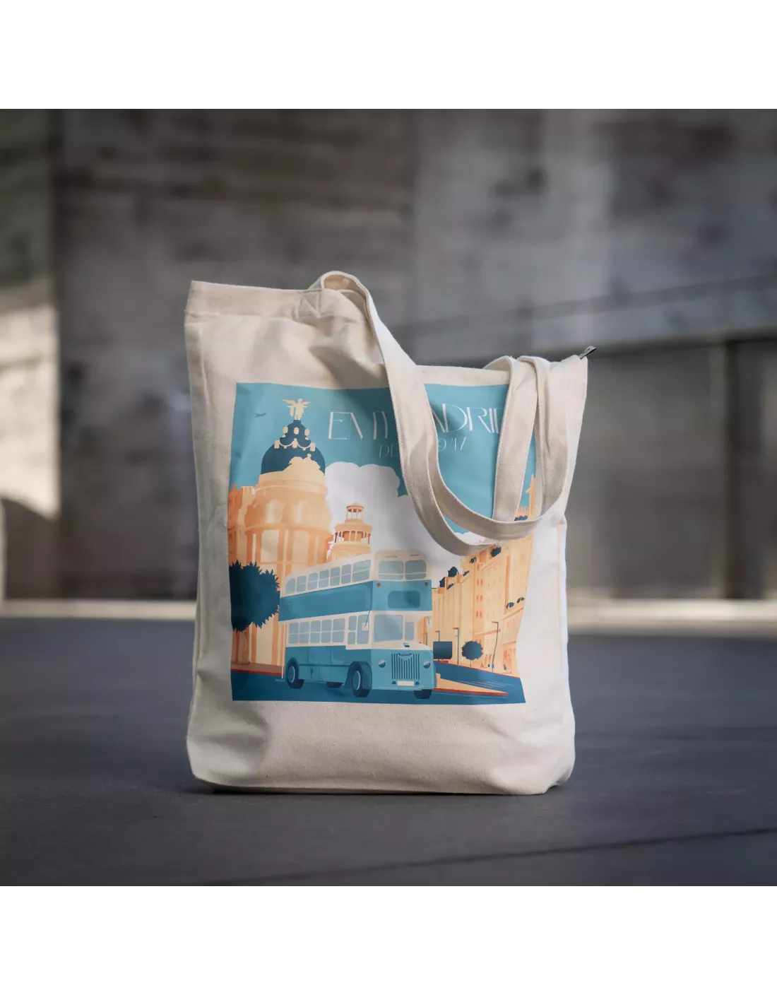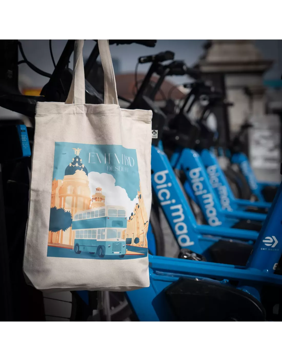 Fabricada en resistente tela de 270 g en tono beige natural, la bolsa esta confeccionada en 100 % algodón orgánico. Cuenta con unas medidas de 38 x 9 x 42 cm y con asas largas de 70 cm reforzadas con costura en cruz para mayor estabilidad y durabilidad. Su diseño, con estética vintage, incluye una ilustración del clásico autobús Leyland de EMT.
