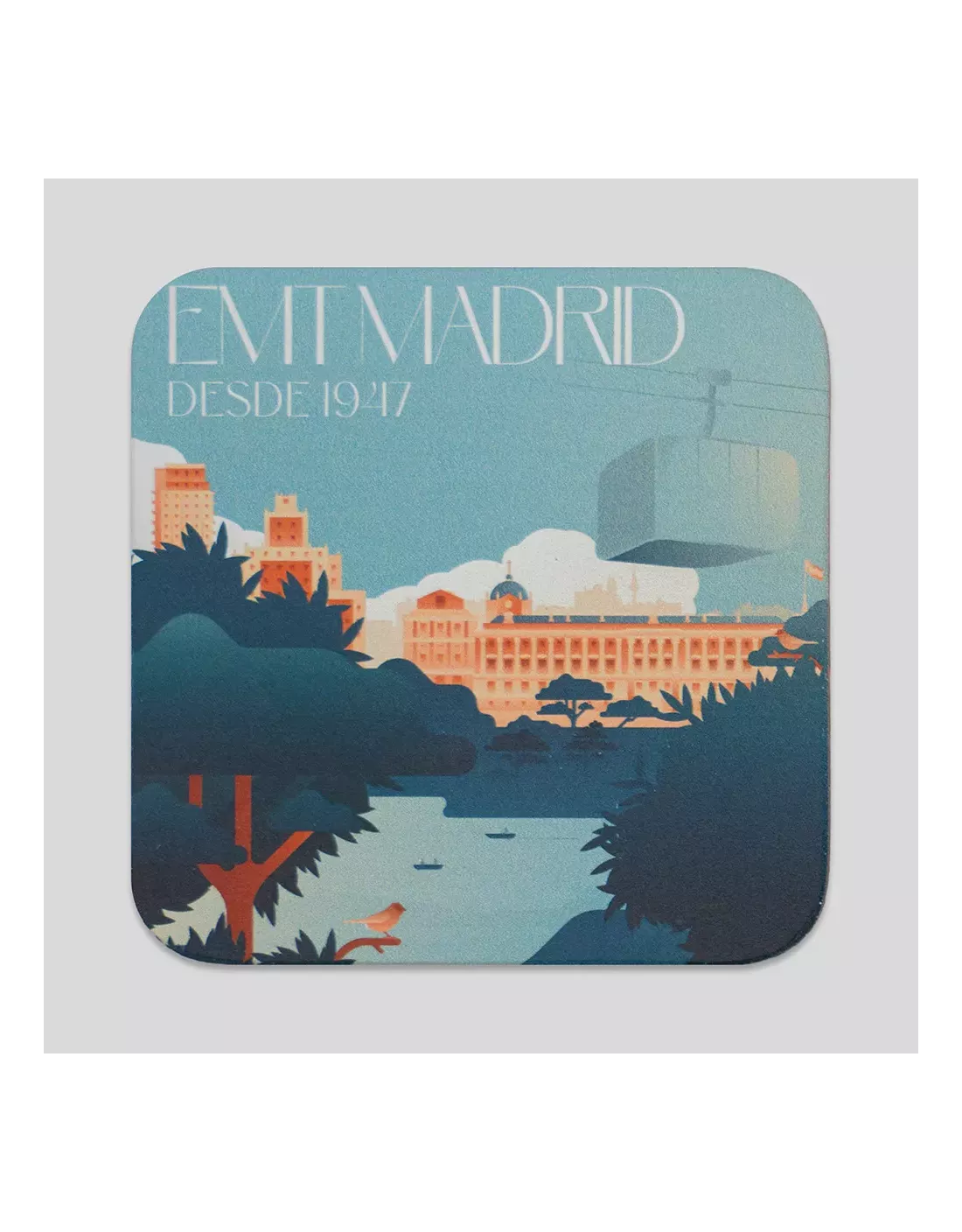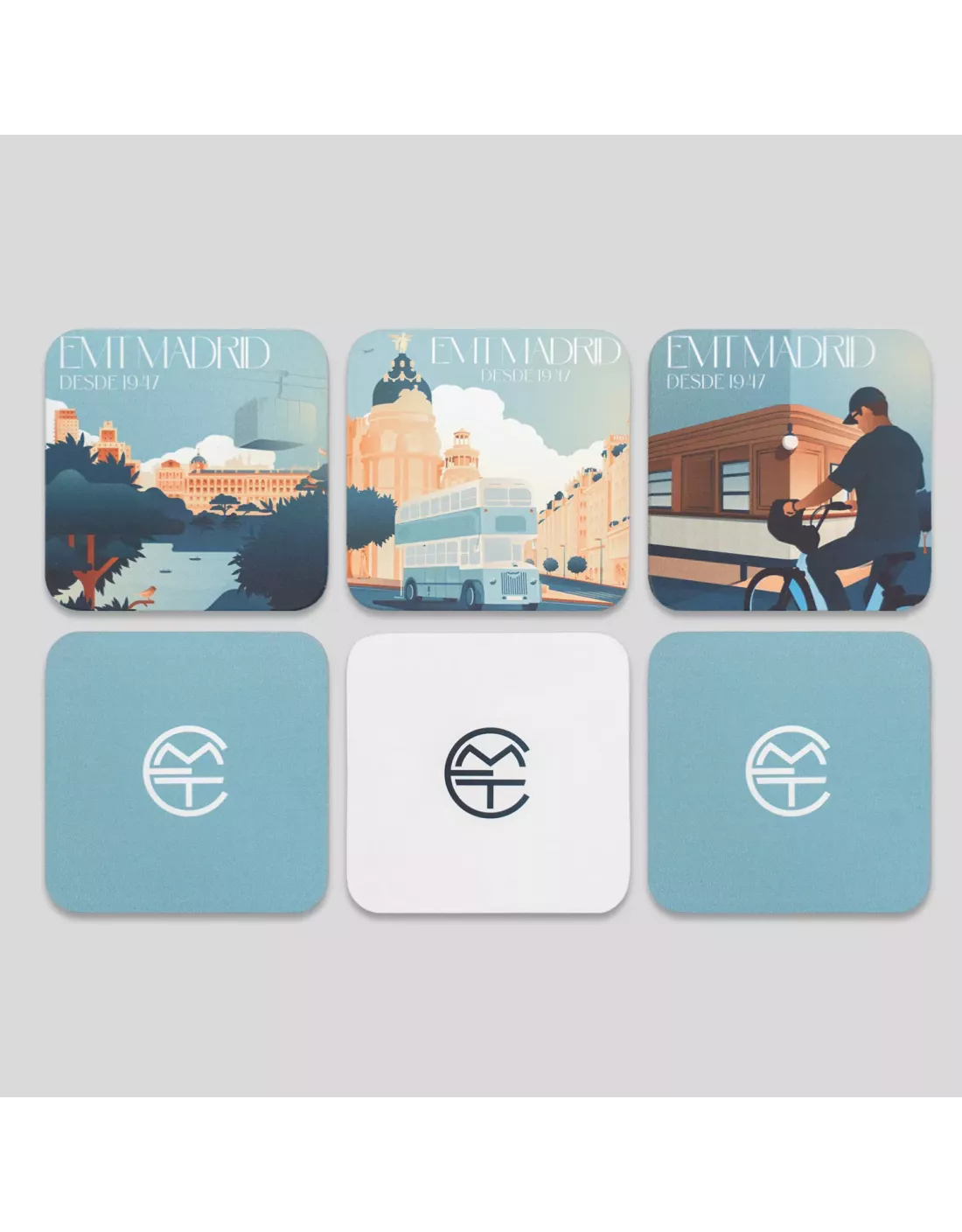 Tres de los posavasos incluyen el logotipo original de la Empresa Municipal de Transportes (1947-1979) y, los otros tres, recrean escenas inspiradas en la historia de EMT y de Madrid.
