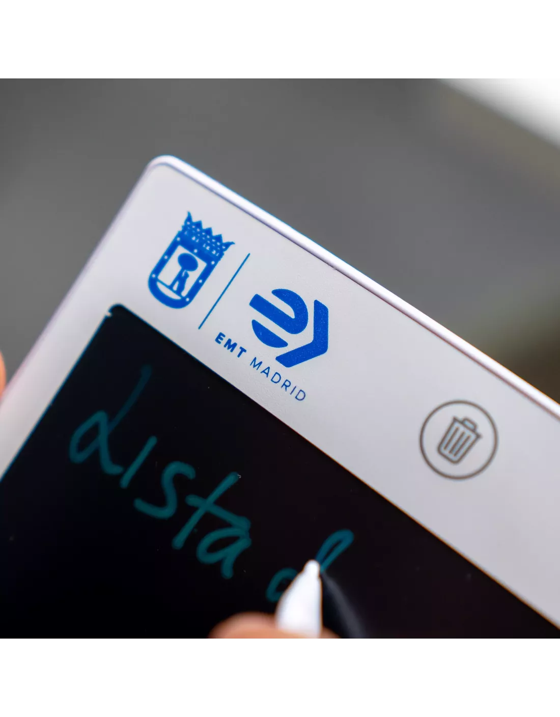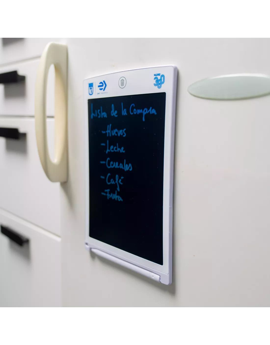 Tableta LCD EMT de 8,5 pulgadas. Equipada con lápiz, botón de borrado, bloqueo anti borrado y fijación magnética. Se adhiere fácilmente a superficies metálicas como la nevera, donde podrás anotar las tareas diarias o comprar pendientes. Su batería remplazable permite más de 100.000 borrados, lo que equivale lo que equivale a un ahorro de 100.000hojas de papel.