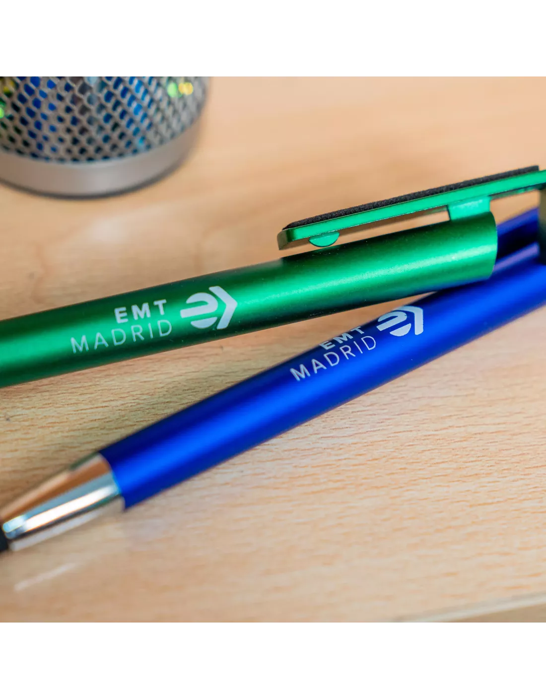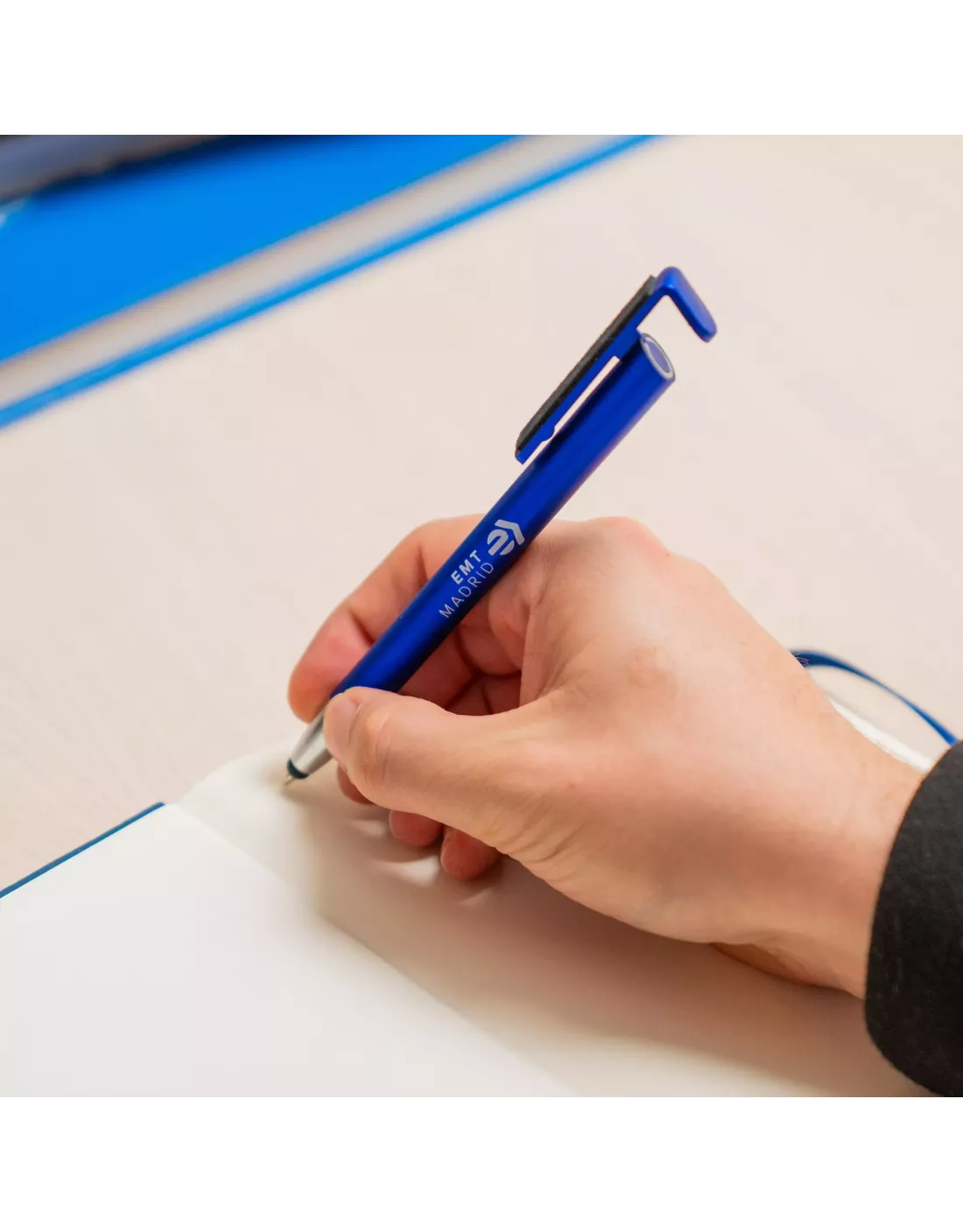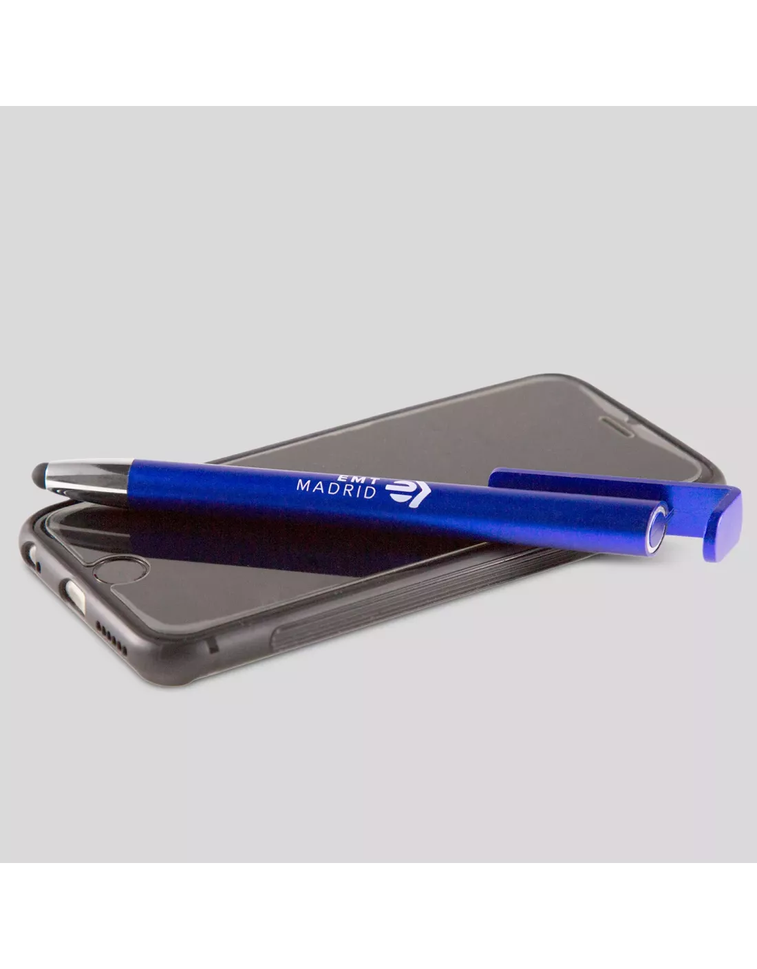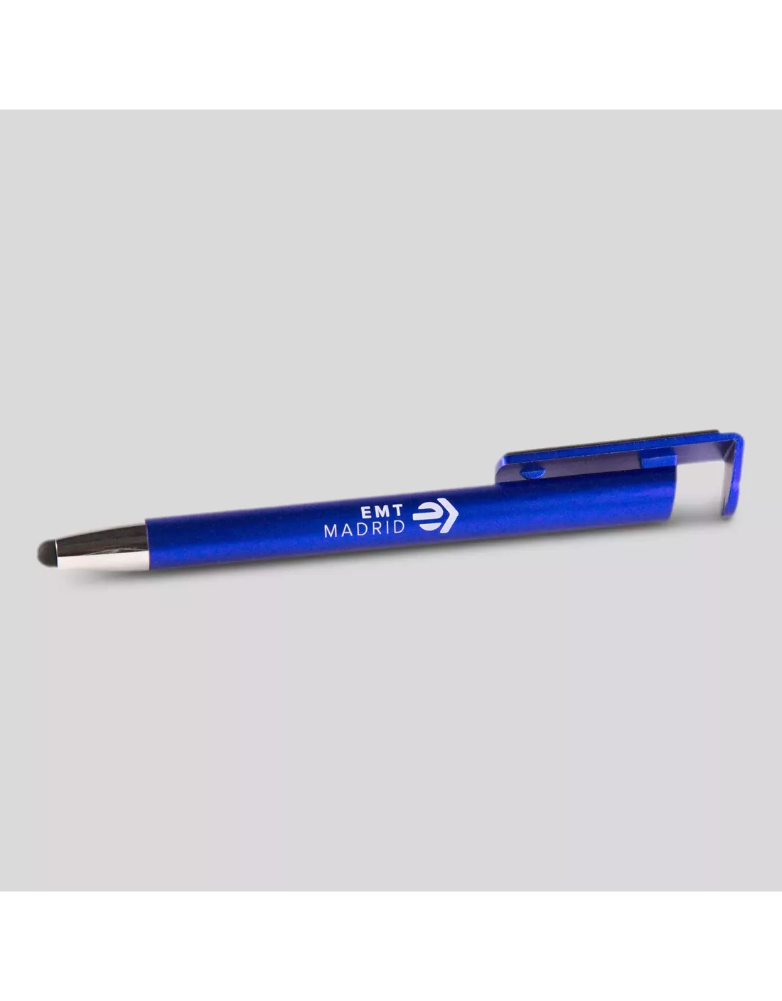 Bolígrafo en color azul, decorado con el logotipo actual de EMT Madrid. Su diseño multifuncional incorpora un práctico soporte para dispositivos móviles.
