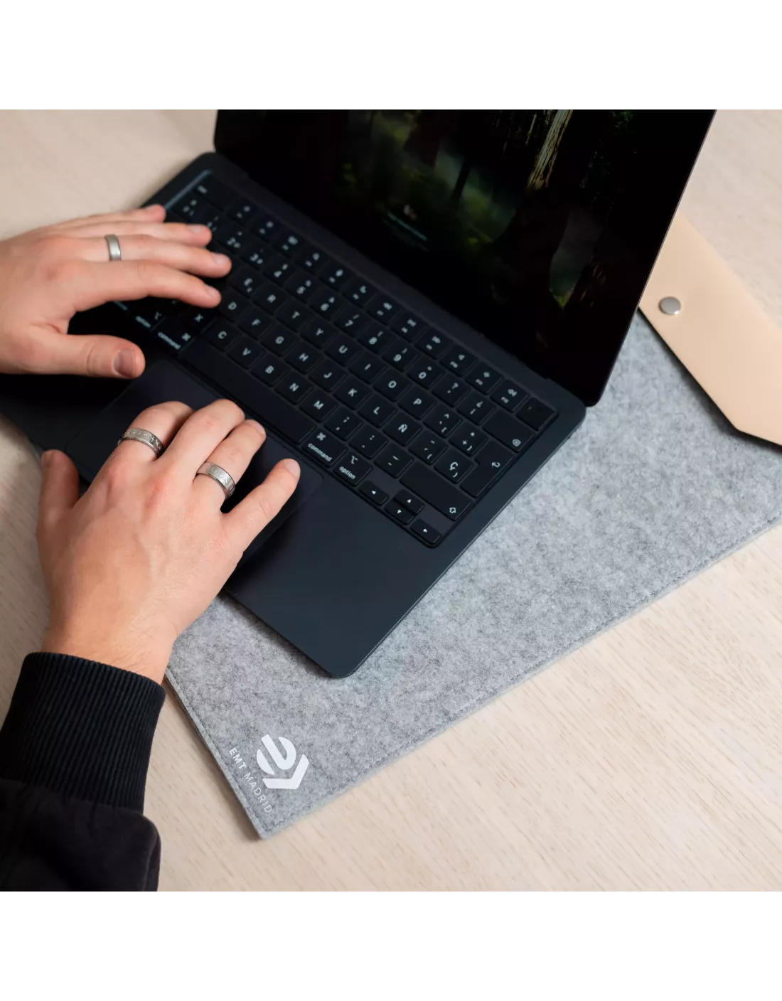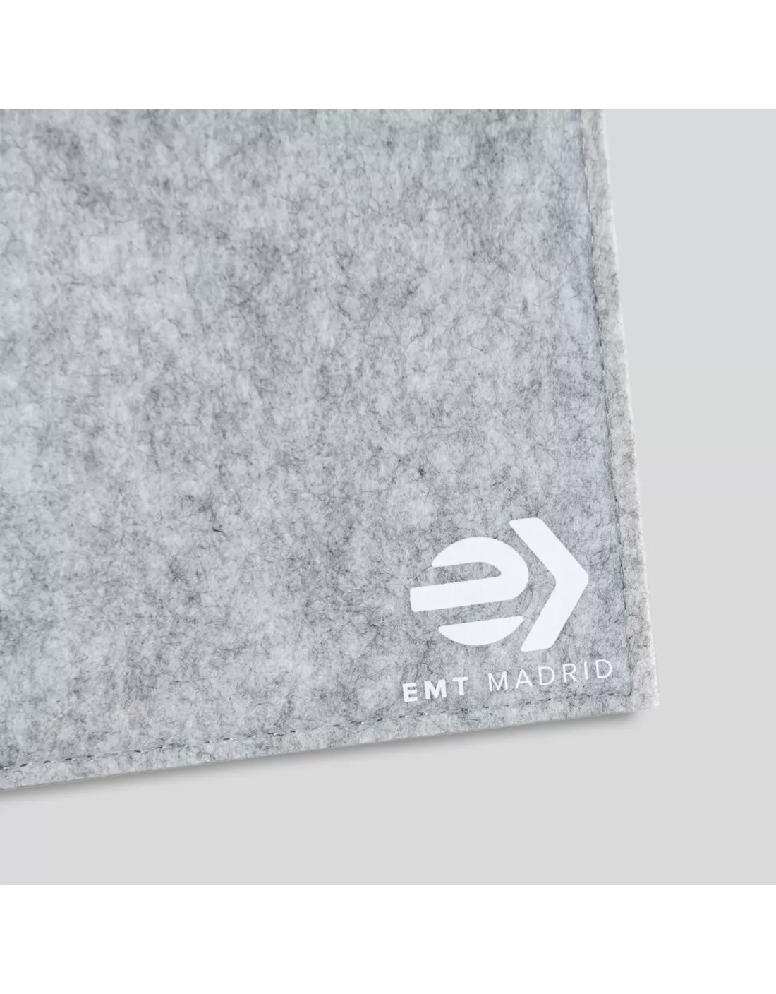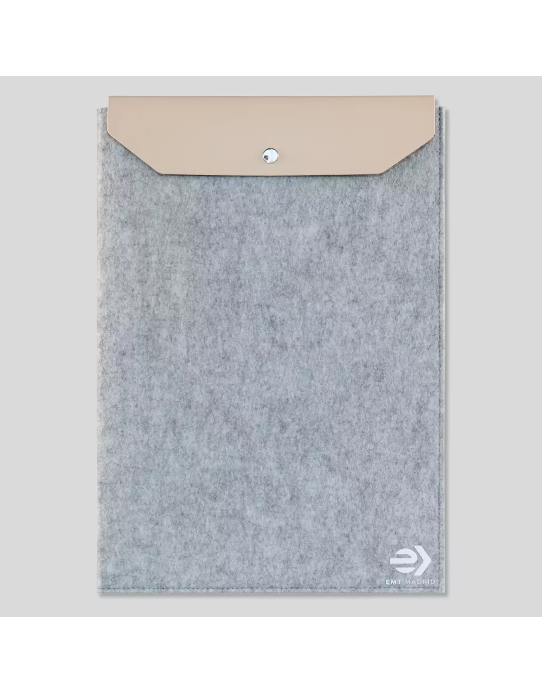 Funda para portátil de EMT, diseñada con una estética refinada y minimalista. Fabricada en fieltro reciclado con certificado GRS y acabado melange (efecto jaspeado), es compatible con portátiles de hasta 17".
