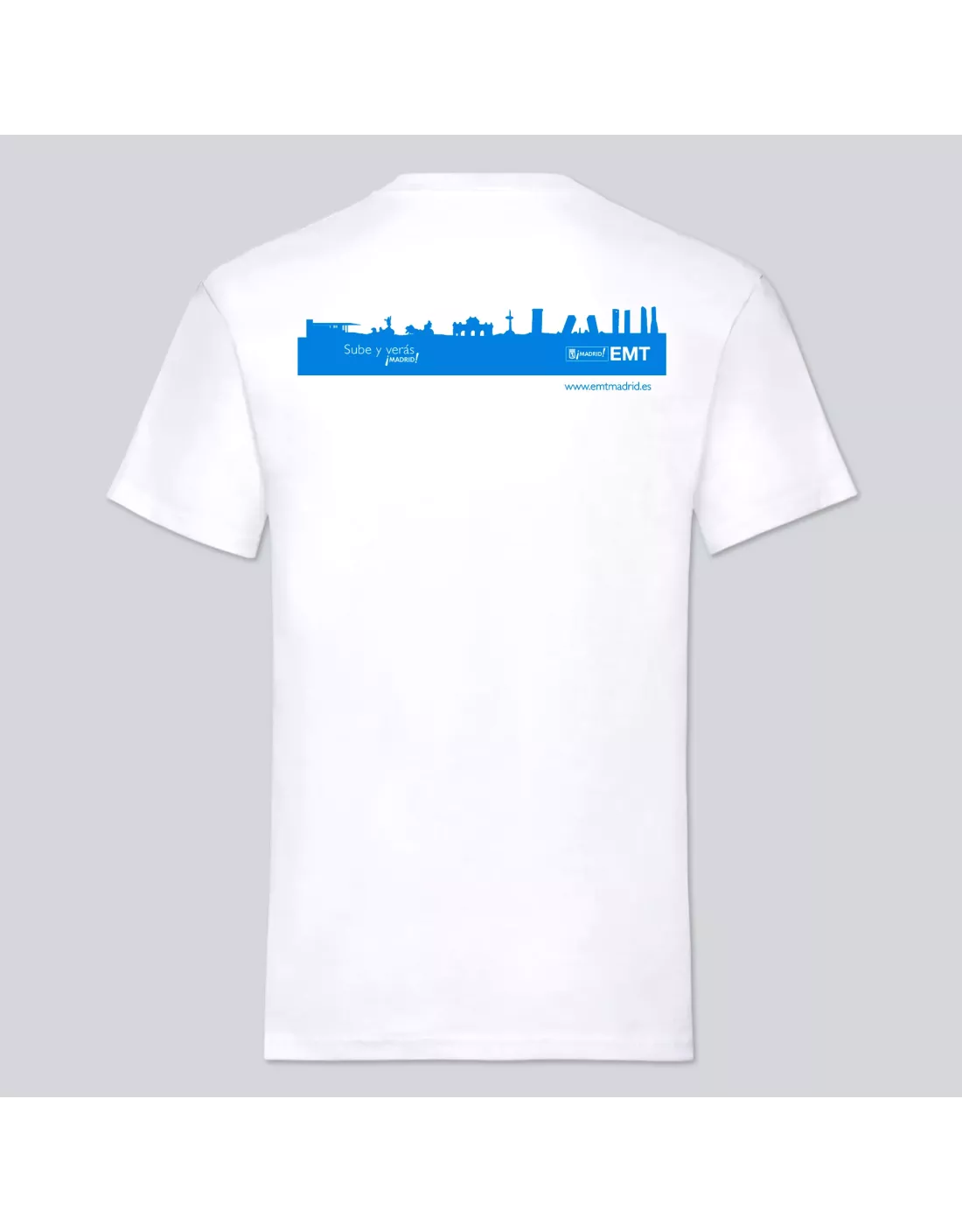 Camiseta blanca 100% algodón, unisex, en diferentes tallas, con el logotipo de EMT Madrid en el pecho y nuestro exclusivo skyline "sube y verás" en la espalda.