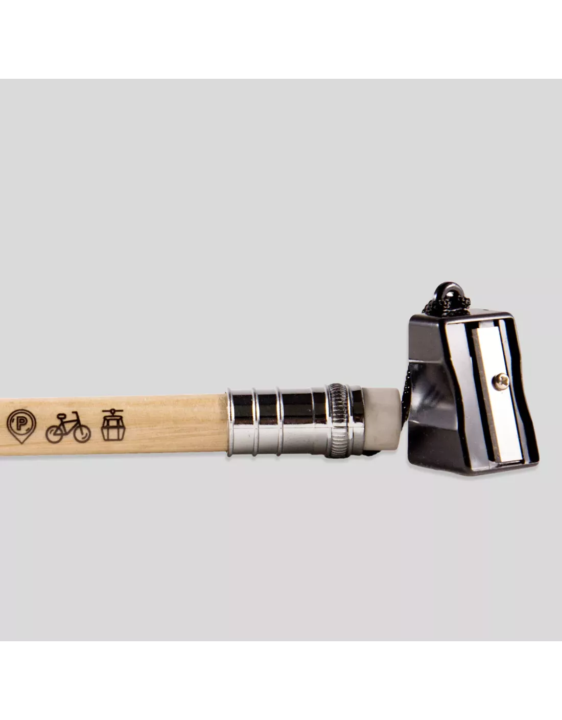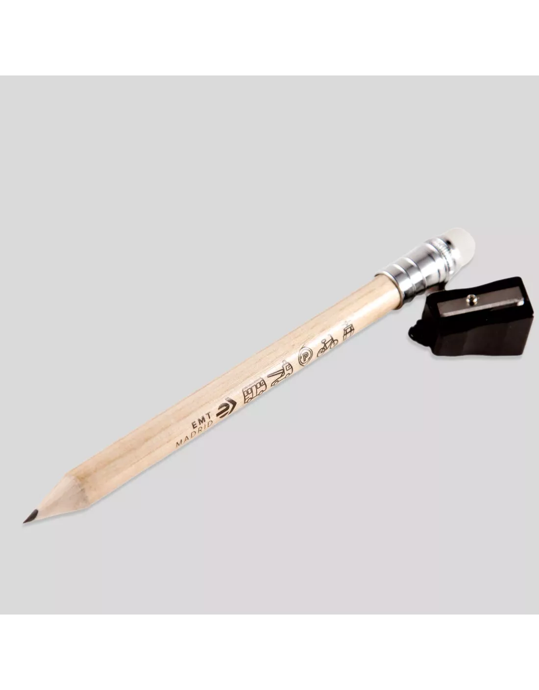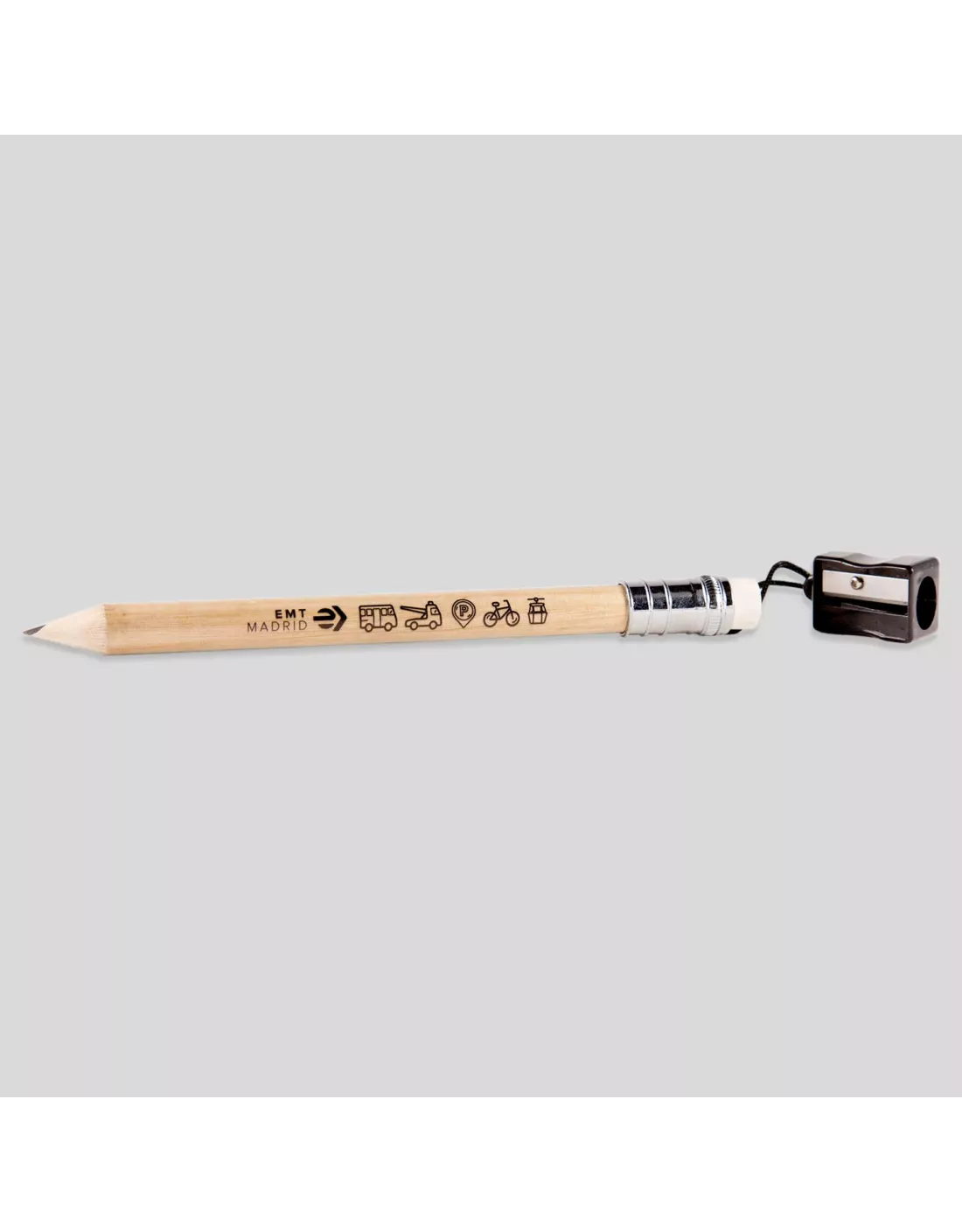 Este lápiz jumbo, decorado con los iconos de los servicios de EMT Madrid viene con goma y sacapuntas unidos por una cuerda de nylon. Sus medidas son 20 cm de largo x 1,5 cm de diámetro.