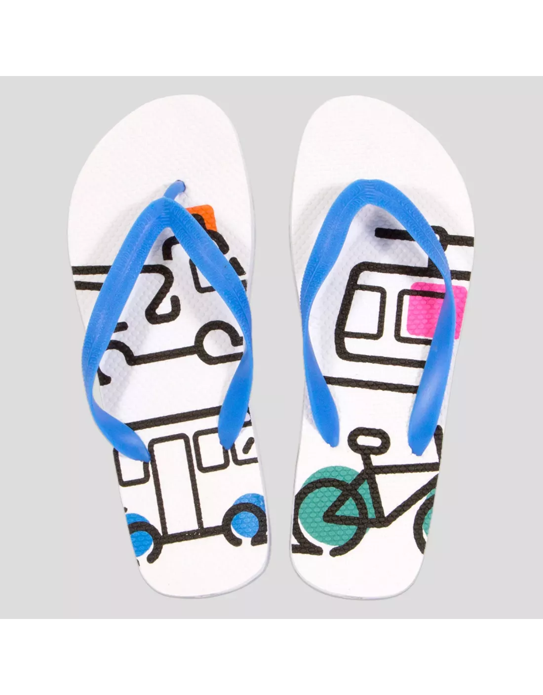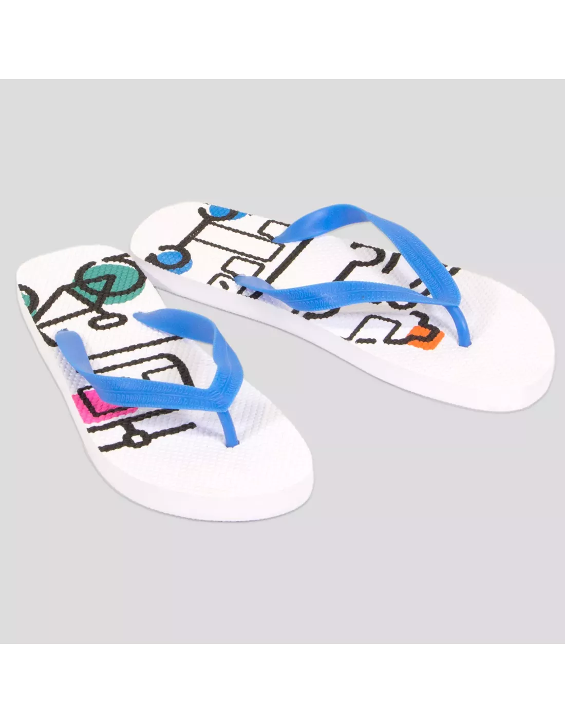Chanclas fabricadas con suela de EVA de 15 mm de grosor y cintas de PVC, decoradas con los iconos de los distintos servicios de EMT Madrid.