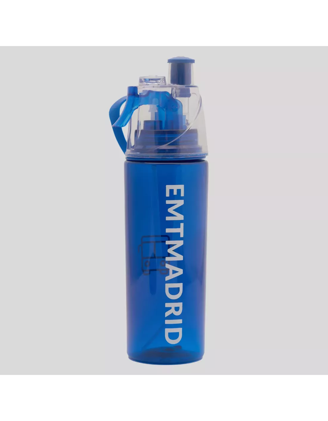 Práctica botella con vaporizador, ideal para excursiones, actividades al aire libre y deporte. Con un diseño moderno en color azul y el logotipo oficial de EMT Madrid, combina estilo y funcionalidad.