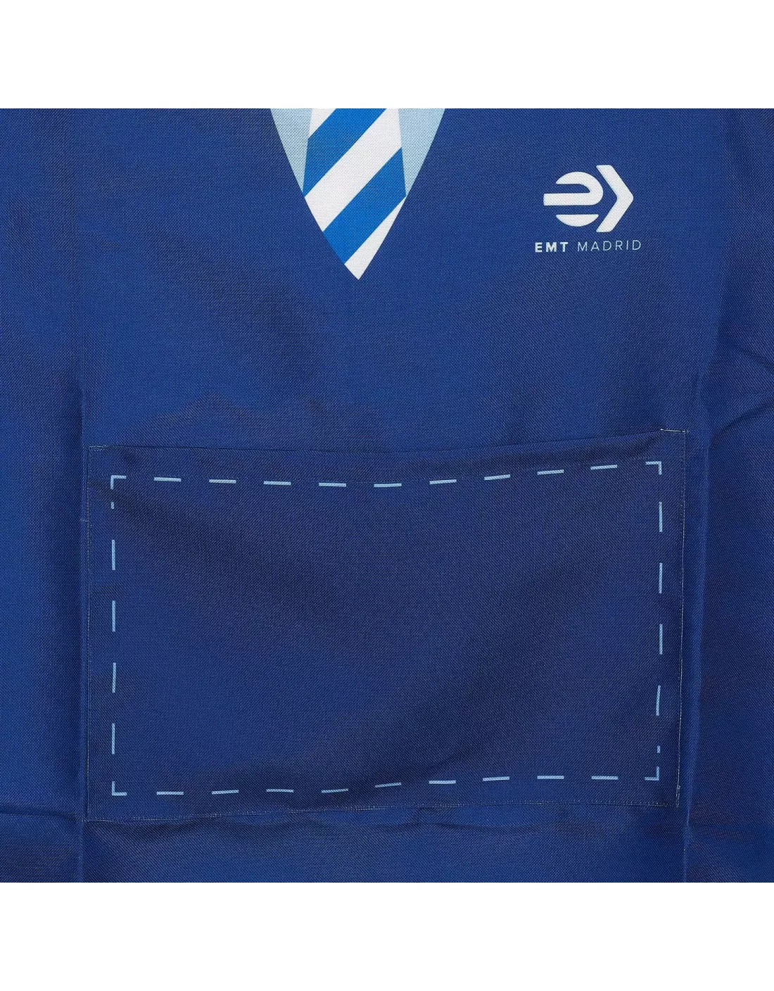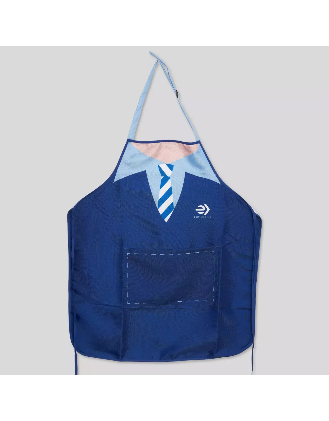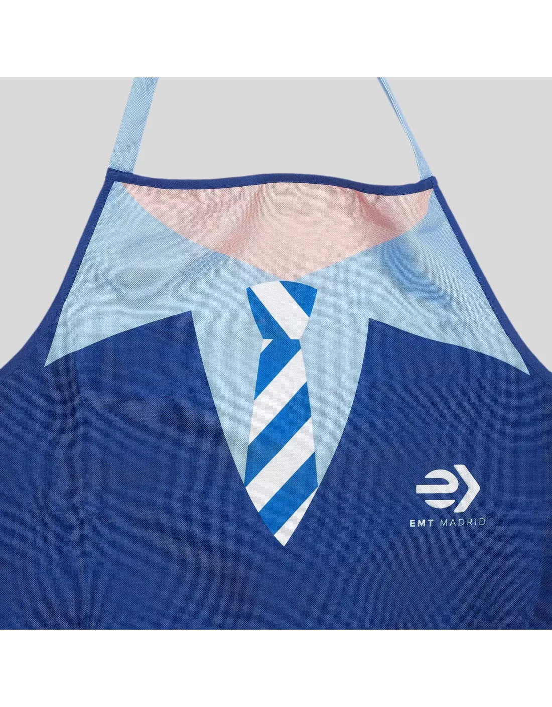 Original y práctico, este delantal integral simula un uniforme de conductor de EMT Madrid. Fabricado en 100% poliéster, incluye bolsillo frontal y cordones de sujeción.