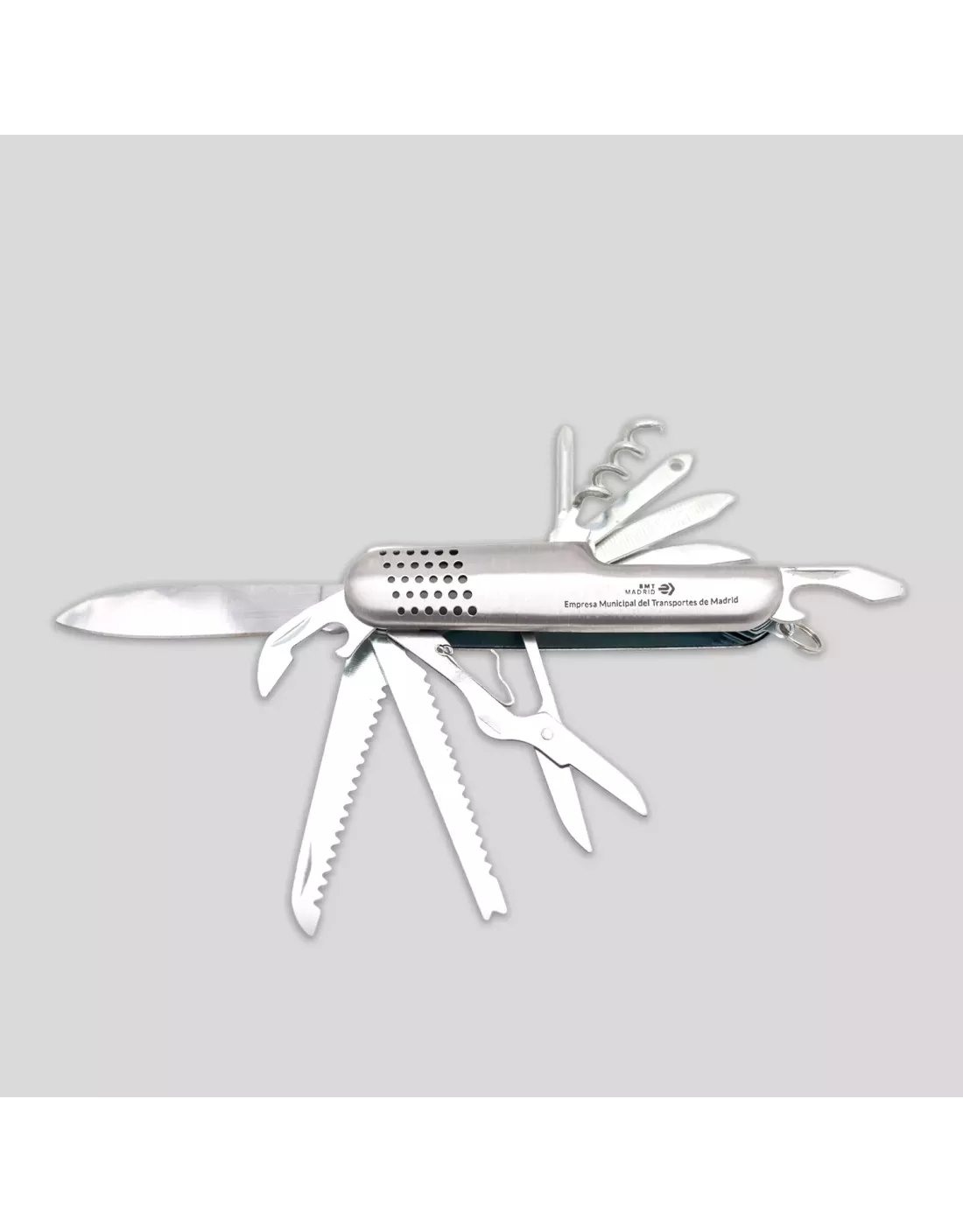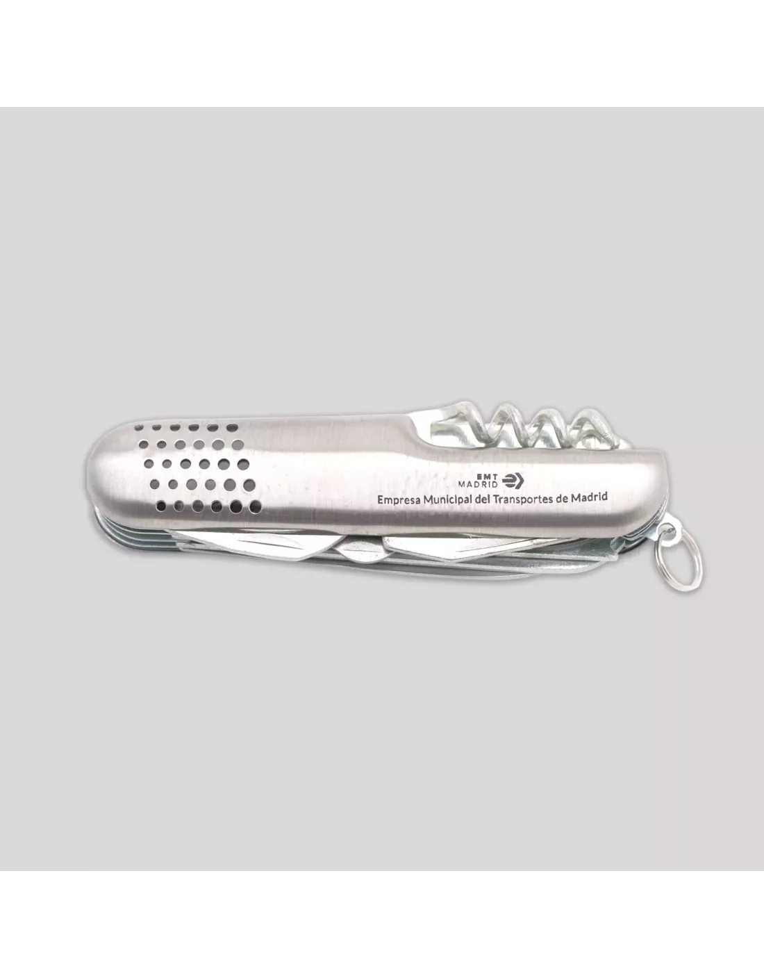 Máxima utilidad en el mínimo espacio con esta navaja multifunción de 9 cm, en elegante color azul y con distintivo de EMT Madrid. Perfecta para excursiones, reparaciones rápidas o como un accesorio urbano siempre listo.